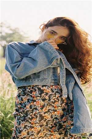 她穿着一件宽松的米白色针织开衫,里面穿着一个吊带长裙,裙摆边缘修整细小的雏菊。